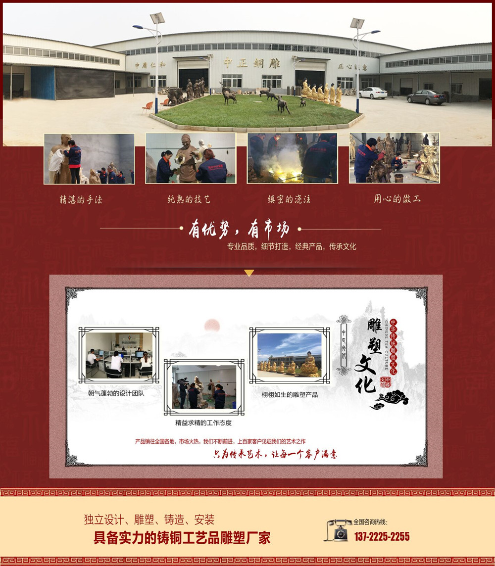 唐縣中正鑄銅雕塑制作生產(chǎn)廠家是一家具有獨(dú)立設(shè)計(jì)、雕塑、鑄造、制作施工能力的單位。擁有完善的,大型的,先進(jìn)的生產(chǎn)設(shè)備,并由多位經(jīng)驗(yàn)豐富的高級鑄造技師指導(dǎo)生產(chǎn)及制作。公司主要鑄造人物雕塑、動物銅雕、城市雕塑、銅佛像、銅獅子、鑄銅鼎、銅鐘等銅工藝品,可按客戶提供銅雕圖片訂做加工,銅雕塑做工精美,質(zhì)量有保證。